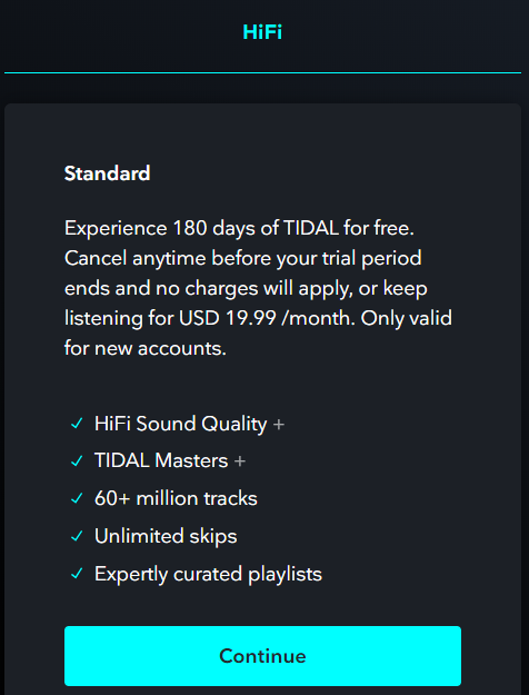 Subscription plans Tidal offers a 30-day free trial for new subscribers and for a limited time you can get a whole six months for just 4 and that goes for the HiFi tier too. Experience 180 free days of TIDAL. You can also try AudKit Tidizer Music Converter in lossless audio quality forever.